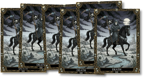 Death Wish is a simple to perform effect that is always ready to go. You challenge you audience to ‘Wish You Dead’ in a very unpleasant manner. They have a choice of face down death cards which are eliminated one by one (free choice). Each is seen to describe a hideous death, however the remaining chosen card is turned over to reveal a fate of fortune and prosperity!