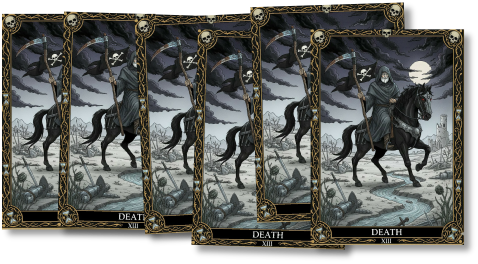 Death Wish is a simple to perform effect that is always ready to go. You challenge you audience to ‘Wish You Dead’ in a very unpleasant manner. They have a choice of face down death cards which are eliminated one by one (free choice). Each is seen to describe a hideous death, however the remaining chosen card is turned over to reveal a fate of fortune and prosperity!