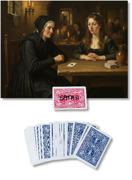 The performer then tells of how in the Middle Ages playing cards were banned throughout Europe as the Church said that they were the playthings of Satan. He goes on to tell that it is said that Satan marks a card in every deck and, that the only people who know which card is marked by Satan are the Evil One himself and those in league with him. This fact was used as a trial for witchcraft. The person suspected of being a witch was asked to name a card and if that card was marked by Satan, then the fate of the subject was execution.